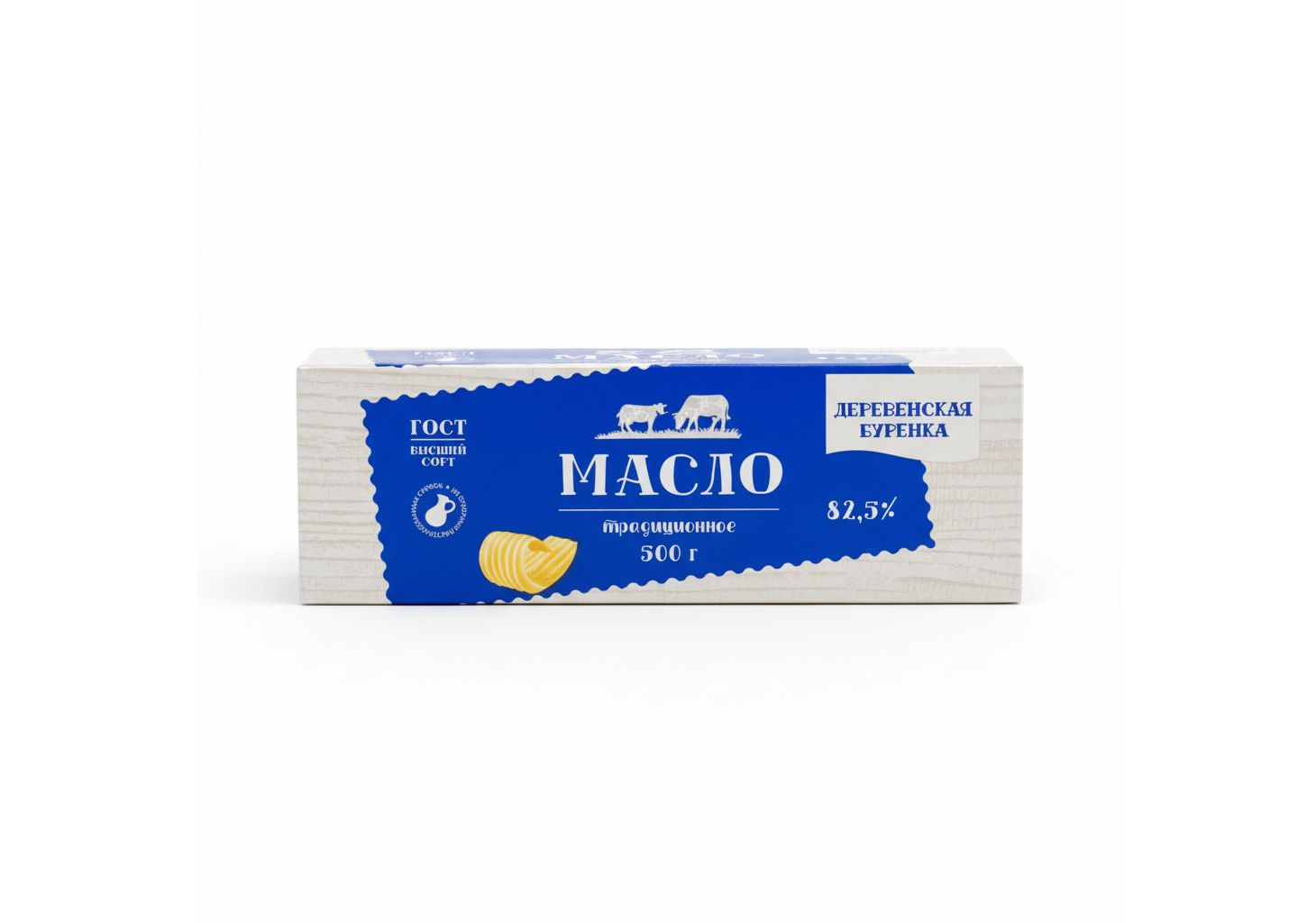 Описание Масло сливочное Деревенская буренка Традиционное несоленое 82,5% 500г